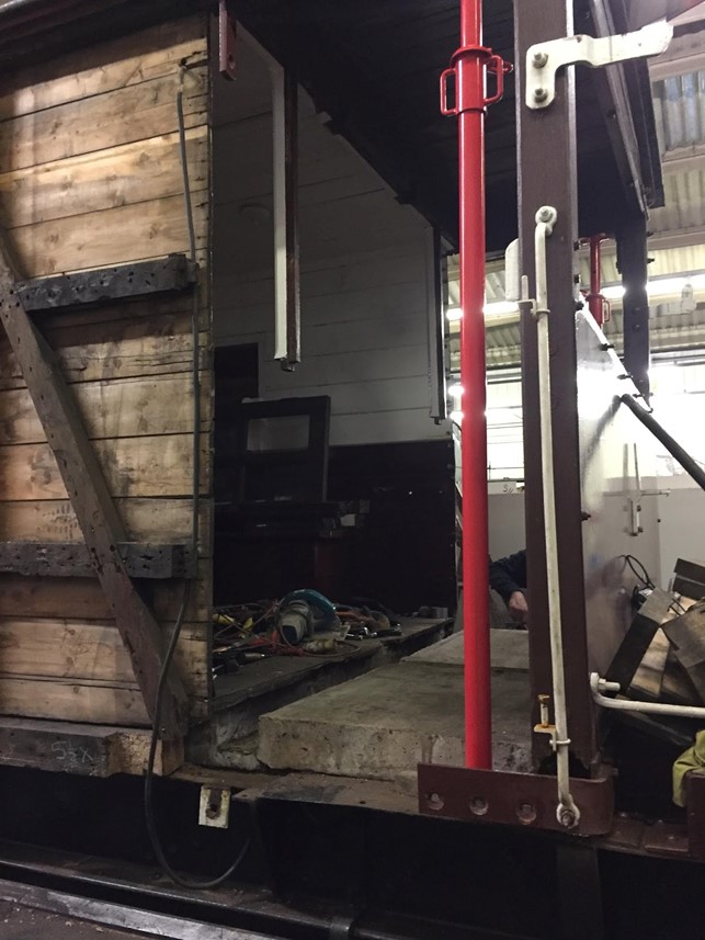 Once the underframe was cleaned and repainted, we could make a start on replacing the rotten wood. The main timbers of the van were originally mahogany, a timber much used in carriage construction because of its straight grain and freedom from knots. It is also much easier to work than teak. However, by 2018, many of the timbers were suffering from severe rot and needed replacement. Mahogany was not an option for us so we used Douglas Fir instead.