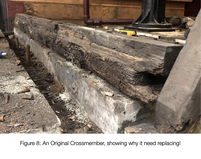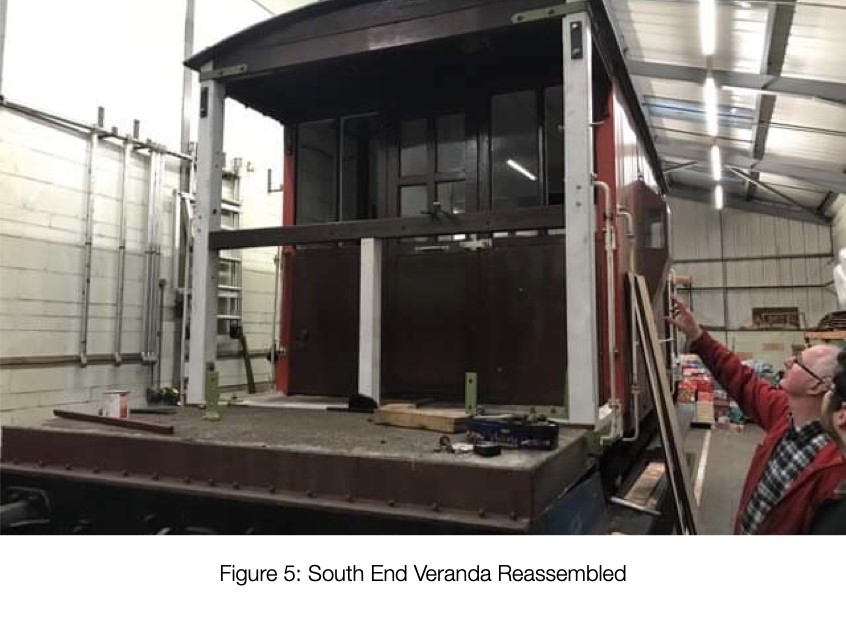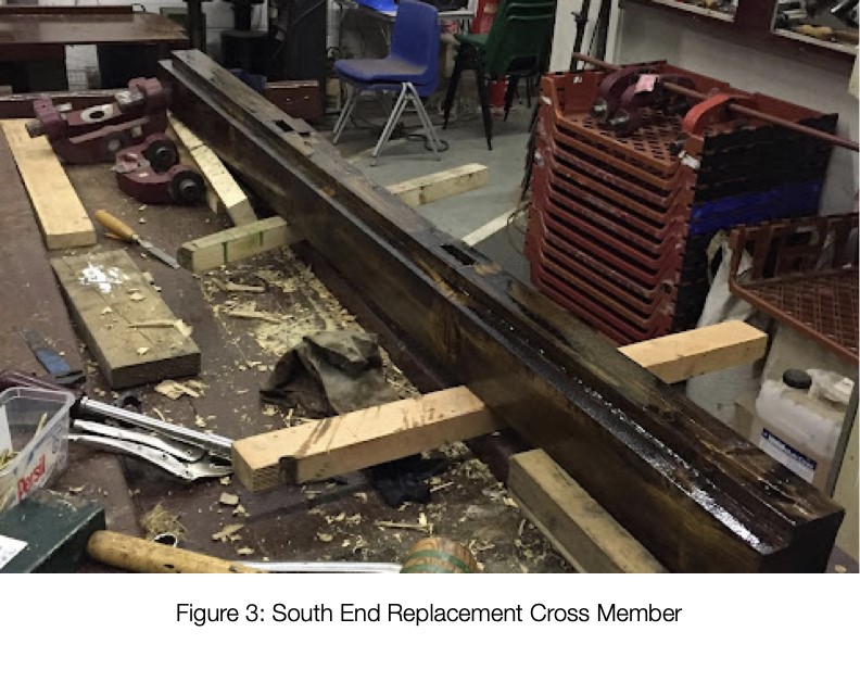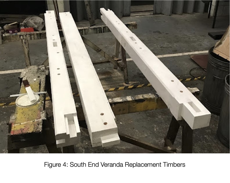 Figure 2 shows the South End with the cross member and uprights removed Both uprights and the cross member needed replacing and Figure 3 shows the replacement cross member. With the South End repaired, we could move onto the South End Veranda. Once again, the timbers were in poor condition needed replacement. Figure 4 shows the replacement timbers and Figure 5 shows them reassembled. Figure 6 shows the South End restoration nearing completion.