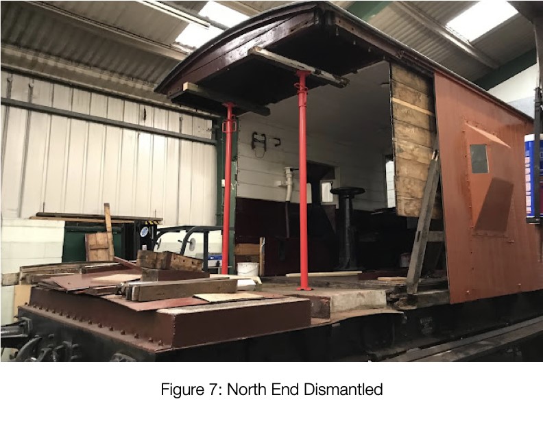 With the South End complete, the Brake Van was returned to service for a few months until we were ready to undertake the repairs to the North End.For convenience, we carried out the restoration of the North End and the North End Veranda at the same time. Figure 7 shows the North End disassembled. On the right hand side you can see distortion caused by corrosion to the solebar. This could not be removed, so a replacement side member had to be cut to fit around it. Figure 8 shows the condition of one of the original cross members.