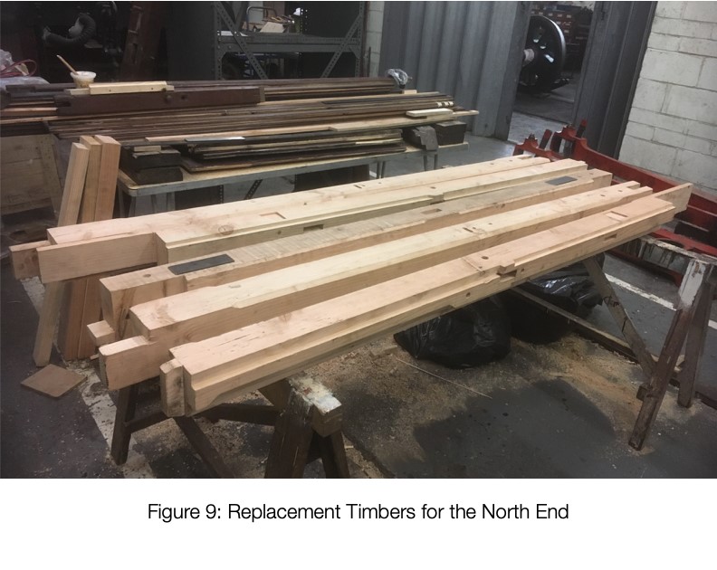 Figure 9 shows some of the replacement timbers for the North End. These were all cut from Douglas fir using the the machines in the Wood Shop – a bandsaw, table saw and a planer/thicknesser. Mortices were cut with a router and the squared up using chisels.